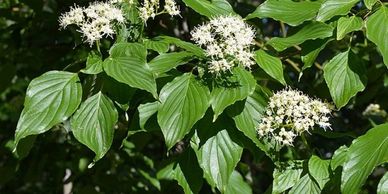 Most Dogwoods are tall, deciduous shrubs or small tree species that can grow 5-10 m in height. It can be grown either in the form of a single stem tree or multi-stemmed shrub comprised of two or three smaller trunks. The flowers bloom between May and June. These flowers produce clusters of dark berries. The flowers are beneficial for pollinator species while the berries are beneficial for wildlife species. The root system is valuable for controlling erosion and stabilizing loose soil.