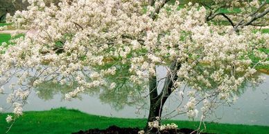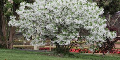 This tree is an all-season beauty. Delicate white flowers bloom in the spring, and vibrant foliage makes an appearance in the fall. Produces plump red berries edible to both birds and humans. Grows 15'-25' high with an equal spread.