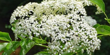 American elderberry is a woody, deciduous shrub or small tree, 5 to 12 feet tall and 6 to 10 feet wide, that is native to North America. It can be found in all areas of North Carolina along streams, marshes, moist forests, and disturbed areas. American elderberry tolerates a wide variety of wet to dry soils but prefers rich, moist, slightly acidic soil in sun to partial shade. Plants will spread by root sucker and will form thickets if the suckers are not removed. In summer, small white flowers are borne in dense clusters. Flowers are followed by a purple-black drupe that is produced in drooping clusters from late summer to fall. The drupe is an edible fruit and when cooked can be used in pies, pancakes, and jellies. Elderberry flowers and fruits are used in winemaking. Wildlife also enjoys the fruits, and the arching branches provide a habitat for nesting birds. Use this plant in naturalized areas, as a hedge, in a woodland, or along streams and ponds. It is a good addition to butterfly, edible, native, pollinator, or rain gardens. It is effective erosion control in moist sites.